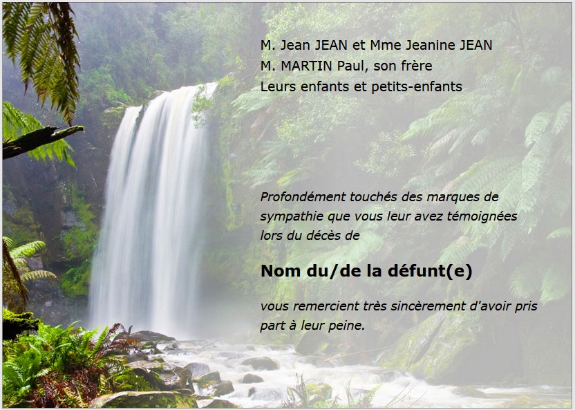 Par exemple, remercier “pour votre présence et vos pensées en ces jours difficiles” fonctionne bien. Remercier “pour votre aide précieuse lors des obsèques de papa” fonctionne aussi, surtout si l’on veut personnaliser un peu sans en faire trop.